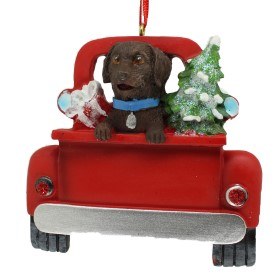 THIS CHRISTMAS ORNAMENT IS MADE OF RESIN AND MEASURES APPROX. 3" X 3.25". IT OF YOUR FAVORITE BREED ON THE BACK OF A PICK UP TRUCK. THIS ITEM CAN BE PERSONALIZED.