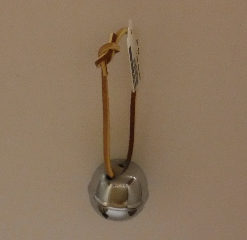 THIS CHRISTMAS ORNAMENT IS OF A #2 CHROME BELL WITH A RAWHIDE TIE. BELL MEASURES 1.5" Located in the Christmas Shoppe in room F, on a wall - board number 749 - 750 Printed maps are available to assist in finding it