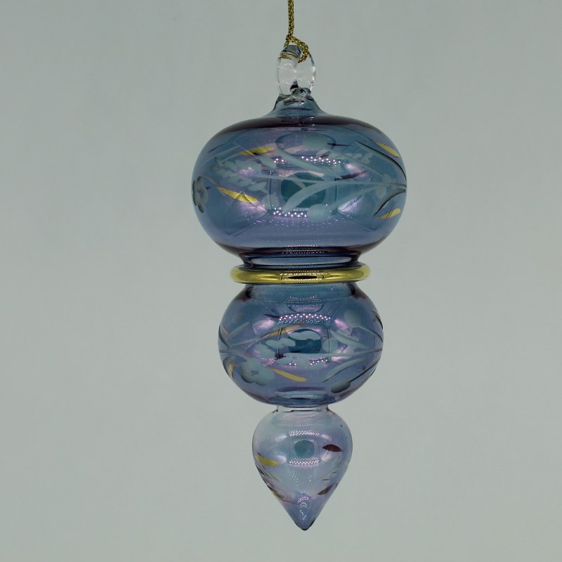 THIS EGYPTIAN GLASS COLLECTIBLE WAS HANDMADE IN EGYPT BY A PROFESSIONAL EGYPTIAN GLASS BLOWER. THIS COLLECTIBLE WAS A MOUTH BLOWN, ENGRAVED WITH A UNIQUE DESIGN, ACCENTED WITH 24 KARAT GOLD TRIM, PAINTED AND FIRED IN A SPECIAL OVEN TO BAKE IN THE EXCEPTIONAL COLOR. MEASURES APPROX. 5" X 2.25" AND IS A DOUBLE SPHERE WITH CONE AND IS BLUE.