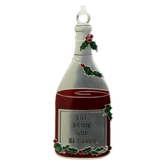 THIS CHRISTMAS ORNAMENT IS MADE OF METAL AND ACRYLIC AND MEASURES APPROX. 4" X 1.5" "EAT, DRINK AND BE MERRY " ENGRAVED ON A WINE BOTTLE.