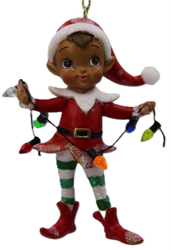 THIS CHRISTMAS ORNAMEN IS AN ELF STANDING HOLDING CHRISTMAS LIGHTS IS RED GREEN AND WHITE AND GOLD WITH GLITTER IS MADE OF RESIN AND MEASURES APPROX 3" X 1.5" X 4.25".
