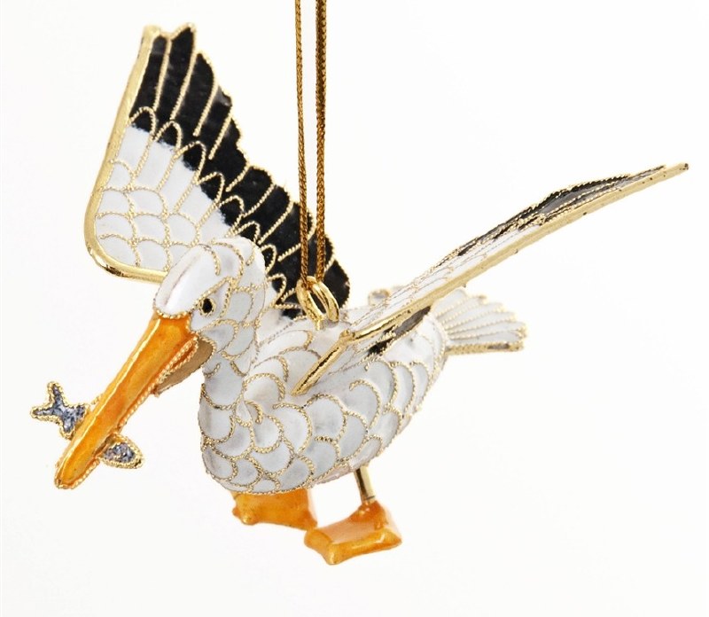 THIS CHRISTMAS ORNAMENT IS OF A WHITE AND BLACK WITH GOLD TRIM STORK HOLDING A FISH. IT MEASURES APPROX 3" X 3.5" X 2".