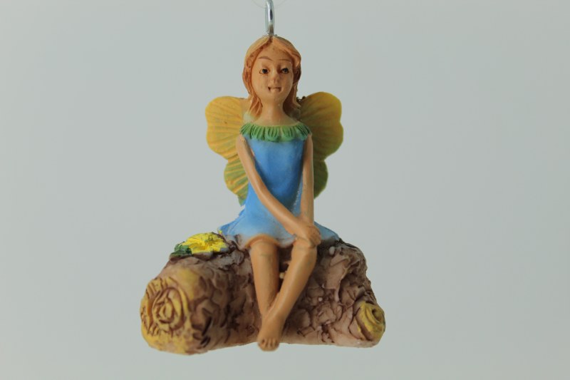 THIS ORNAMENTIS MADE OUT OF RESIN AND IS APPROX. 2 X 2.5 IN SIZE. SHE HAS A BLEW DRESS ON WITH A YELLOW FLOWER BESIDE HER.