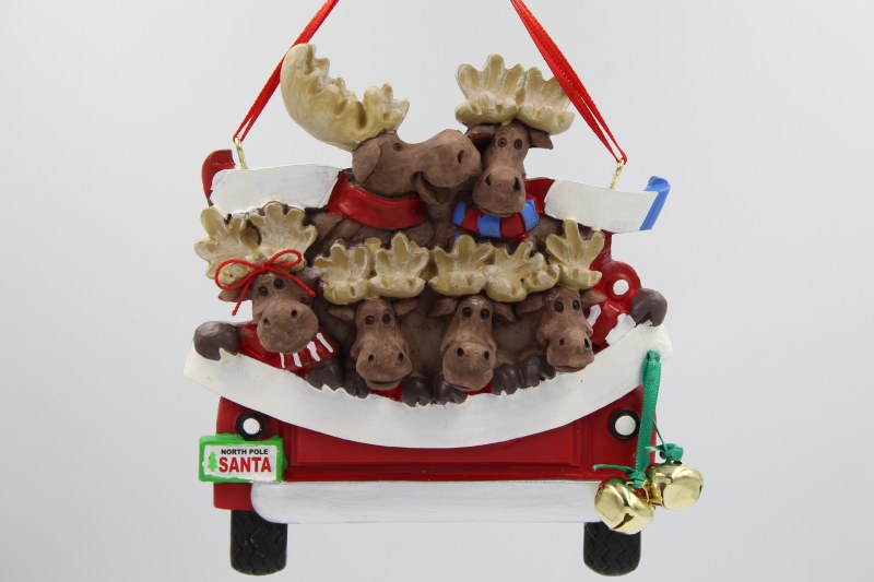 THIS CHRISTMAS ORNAMENT IS MADE OF RESIN AND MEASURES APPROX. 5" X 5.5". PERSONALIZE IT WITH ALL YOUR FAMILY NAMES.