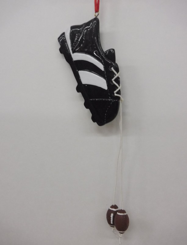 THIS CHRISTMAS ORNAMENT IS MADE OF RESIN AND MEASURES APPROX 8" X 1.5" . THIS ORNAMENT IS OF A FOOTBALL CLEAT.