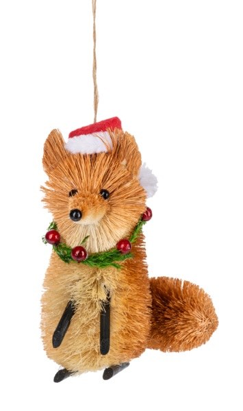 THIS CHRISTMAS ORNAMENT IS OF A FOX BRUSH ANIMAL WEARING BERRY GARLAND AND SANTA HAT. IT MEASURES APPROX. 3.75" X 4.25" X 5" AND IS MADE OF THE BURI PALM TREE.