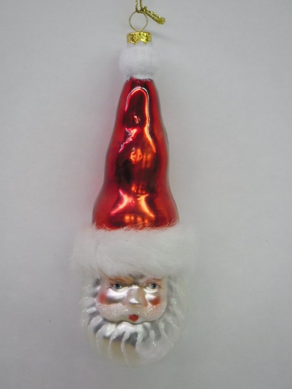 THIS CHRISTMAS ORNAMENT IS MADE OF GLASS AND MEASURES APPROX 6" X 2". THIS ORNAMENT IS OF SANTA'S HEAD. Located in the Christmas Shoppe in room B, on a wall - board number 152 - 154 Printed maps are available to assist in finding it.