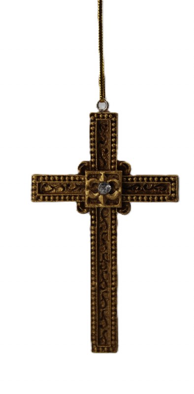 THIS CHRISTMAS ORNAMENT IS OF A GOLD CROSS. IT MEASURES APPROX. 3.5" X 2.5 X 0.25" AND IS MADE OF A HARD PLASTIC.