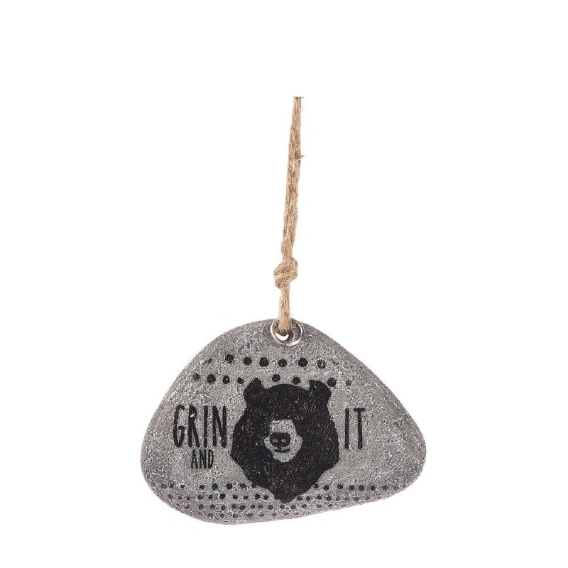 THIS CHRISTMAS ORNAMENT IS MADE OF RESIN AND MEASURES APPROX. 2" X 2.75" AND RESEMBLES A STONE.