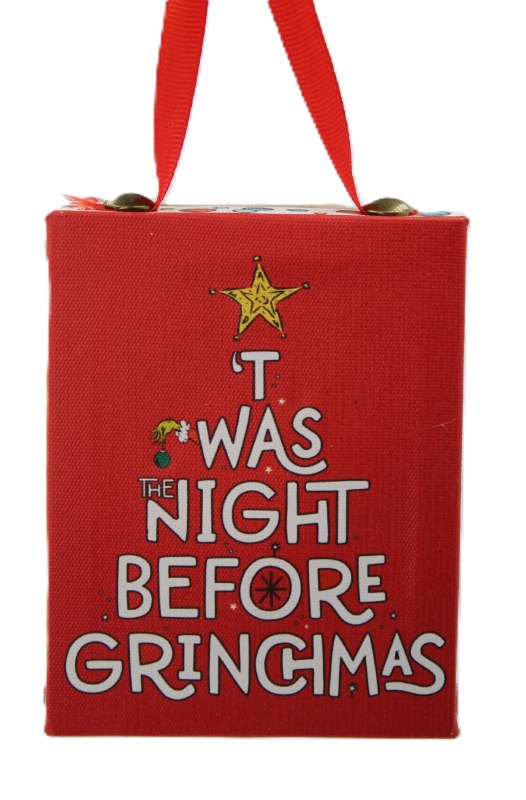 THIS CHRISTMAS ORNAMENT IS OF A GRINCH CANVAS. IT SAYS " IT WAS THE NIGHT BEFORE GRINCHMAS". THIS MEASURES APPROX. 3.5" X 4.5" X 0.75".