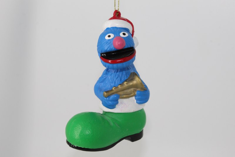 THIS CHRISTMAS ORNAMENT IS OF GROVER FROM SESAME STREET. IT MEASURES APPROX. 4.25" X 3" AND IS MADE OF A POLY RESIN.