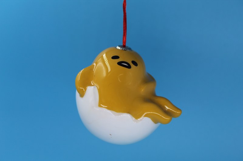THIS ORNAMENT IS OF GUDETAMA THE LAZY EGG FROM THE CARTOON HELLO KITTY. IT MEASURES APPROXIMATELY 3" X 3" AND IS OF A BLOW MOLD.