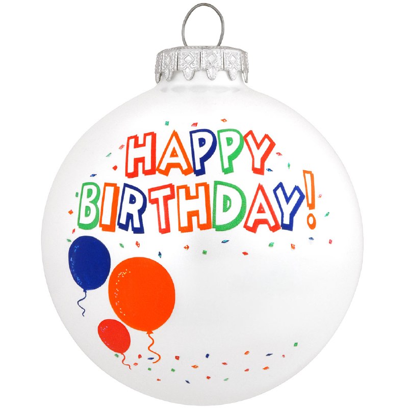THIS CHRISTMAS ORNAMENT IS A GRAY GLASS BALL THAT SAYS "HAPPY BIRTHDAY" IN MULTICOLOR. MEASURING 3" X 3"