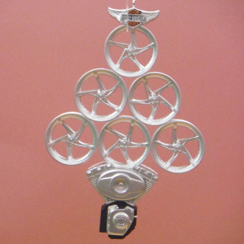 THIS POLY RESIN CHRISTMAS ORNAMENT IS A HAPPY HARLEY DAY. HAS PICTURE OF AN ENGINE BLOCK WITH RIMS AS THE TREE. ITEM MEASURES APPROX 4.5" X 3"