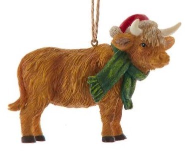 THIS CHRISTMAS ORNAMENT IS OF A HIGHLAND COW. IT MEASURES APPROX. 4" AND IS MADE OF RESIN. Located in the Christmas Shoppe in room D, on a wall - board number 469. Printed maps are available to assist in finding it.