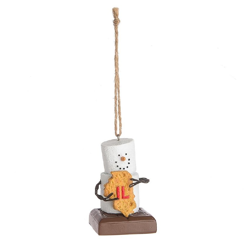 THIS CHRISTMAS ORNAMENT IS MADE OF RESIN AND MEASURES APPROX. 2.5" X 1.5" AND IS OF A SMORE HOLDING A SHAPE OF THE STATE.