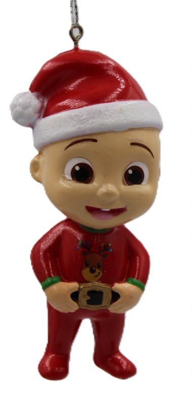THIS CHRISTMAS ORNAMENT IS OF JJ FROM COCOMELON. IT MEASURES APPROX. 4" X 1.5" AND IS MADE OF A RESIN.