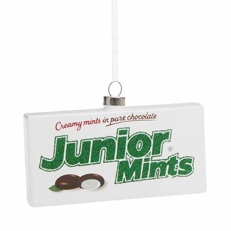 THIS CHRISTMAS ORNAMENT IS OF A BOX OF JUNIOR MINTS CHOCOLATE CANDY. IT IS MADE OF GLASS AND MEASURES APPROX 5" X .75" X 2.5".