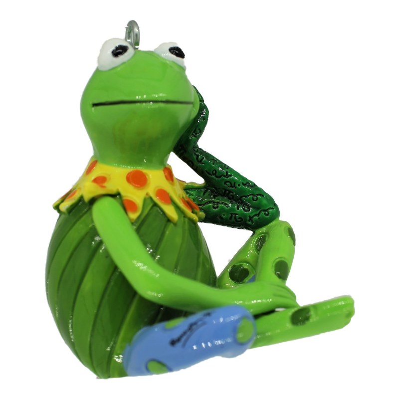 THIS ORNAMENT IS OF KERMIT THE FROG FROM SEASAME STREET. MEASURING APPROX 2.5" X 1.75", AND MADE OUT OF RESIN. Located in the Christmas Shoppe in room D, on a wall - board number 406 Printed maps are available to assist in finding it.