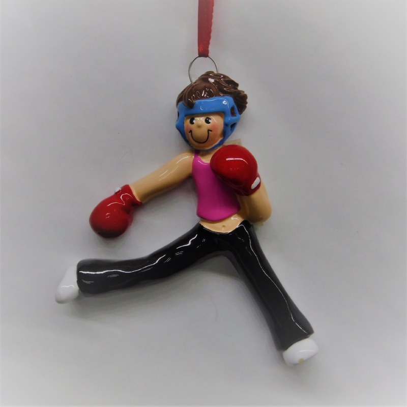 THIS CHRISTMAS ORNAMENT IS MADE OF RESIN AND MEASURES APPROX. 4" X 2.5" AND IS OF A FEMALE KICK BOXER. THIS ITEM CAN BE PERSONALIZED.