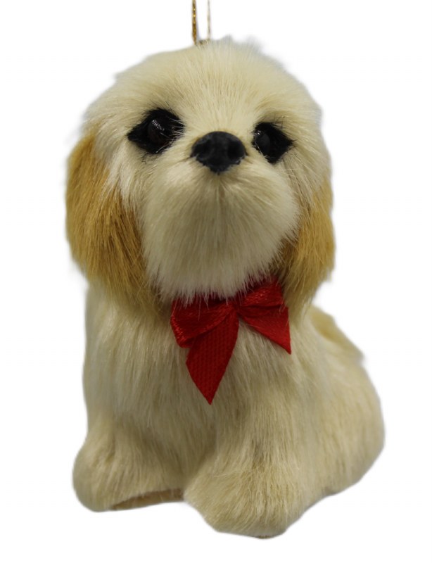 THIS DOG CHRISTMAS ORNAMENT IS MADE OF POLYESTER AND MEASURES APPROX. 3.25" X12.75" X 2.75".