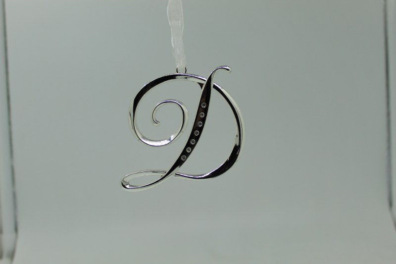THIS CHRISTMAS ORNAMENT IS MADE OF METAL WITH RHINESTONES. IT IS A LETTER D AND MEASURES APPROX. 3.75" X 3.75" .