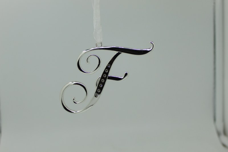 THIS METAL WITH RHINESTONES CHRISTMAS ORNAMENT IS A LETTER F AND MEASURES APPROX. 3" X 2.75" .