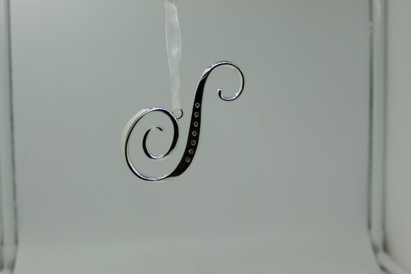 THIS CHRISTMAS ORNAMENT IS OF THE LETTER S. IT MEASURES APPROX. 3.5" X 1.75" AND IS MADE OF METAL WITH FINE EUROPEAN CRYSTALS.