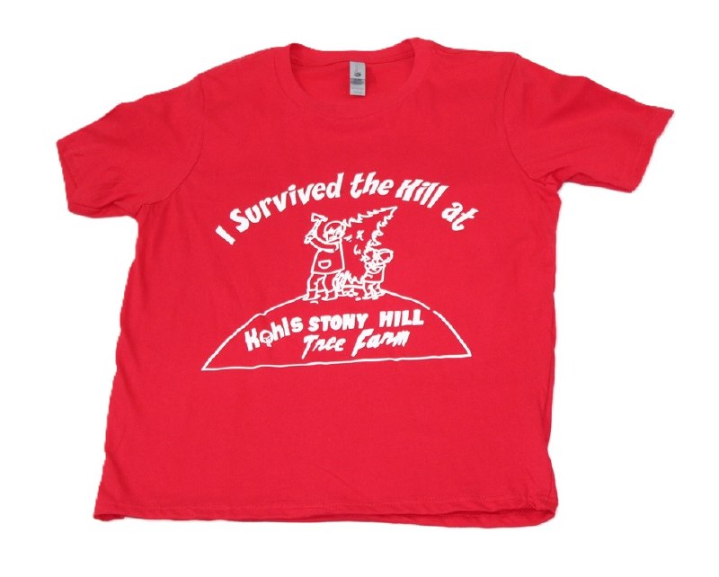 THIS T-SHIRT IS OF YOUTH LARGE WITH OUR WHITE DECAL THAT SAYS "I SURVIVED THE HILL AT KOHLS STONY HILL TREE FARM". ALSO FEATURES A ADULT AND CHILDCUTTING A TREE DOWN. WE WILL CALL WITH COLOR OPTION AS THE DO VARY AT THE TIME OF PURCHASE.