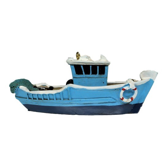 THIS CHRISTMAS ORNAMENT IS MADE OF RESIN AND MEASURES APPROX. 1.5" X 3.5". LIGHT BLUE FISHING BOAT