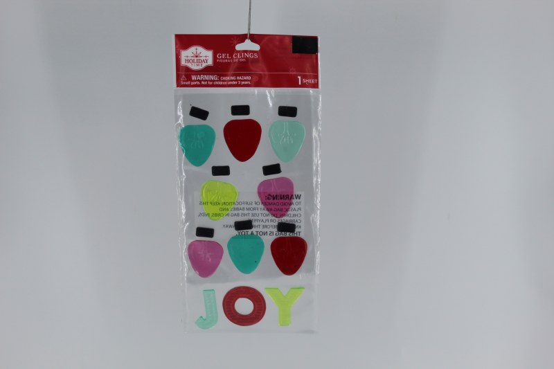 THIS WINDOW CLING IS MADE OF GEL AND RESEMBLES CHRISTMAS LIGHT BULBS AND THE WORD JOY , IT MEASURES 9" X 4.25"