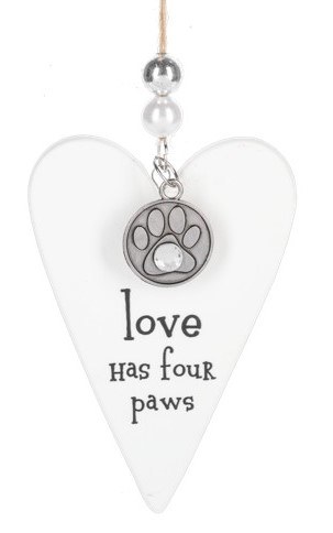 THIS CHRISTMAS ORNAMENT IS OF A WHITE HEART THAT SAYS "LOVE HAS FOUR PAWS". IT'S MADE OF PORCELAIN AND MEASURES APPROX. 4.25" X 3" X 0.25".
