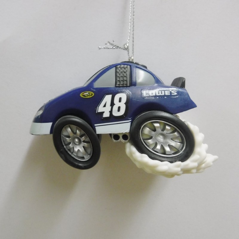 THIS CHRISTMAS ORNAMENT IS OF A BLUE RACECAR DOING A BURNOUT. MEASURES APPROX. 2" X 3". Located in the Christmas Shoppe in room B, on a wood tree - number 195 Printed maps are available to assist in finding it.