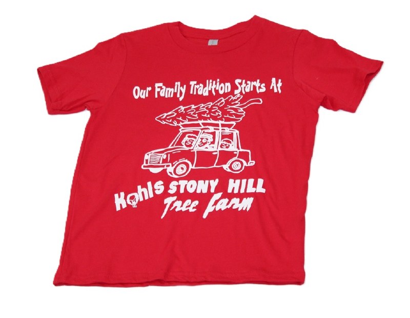 THIS T-SHIRT IS OF YOUTH MEDIUM WITH OUR WHITE DECAL THAT SAYS "OUR FAMILY TRADITION STARTS AT KOHLS STONY HILL TREE FARM". ALSO FEATURES A CAR WITH A TREE ON TOP. WE WILL CALL WITH COLOR OPTION AS THE DO VARY AT THE TIME OF PURCHASE.