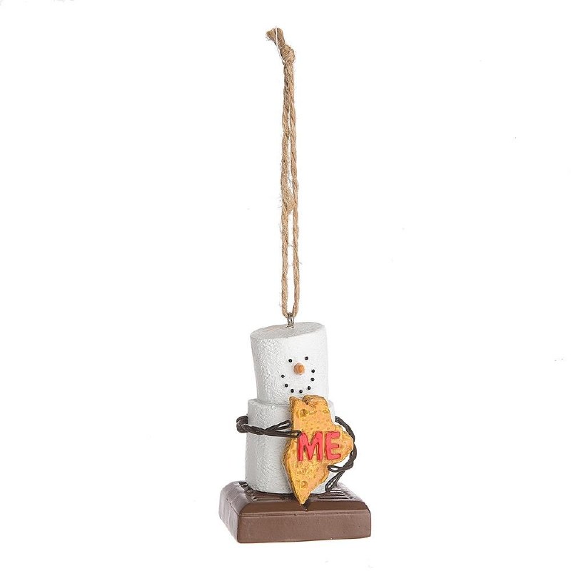 THIS CHRISTMAS ORNAMENT IS MADE OF RESIN AND MEASURES APPROX. 2.5" X 1.5" AND IS OF A SMORE HOLDING A SHAPE OF THE STATE