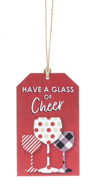 THIS CHRISTMAS ORNAMENT IS OF A WINE GLASS THAT SAYS "HAVE A GLASS OF CHEER". IT MEASURES APPROX. 2.75" X 4.5" AND IS MADE OF FIBREBOARD.