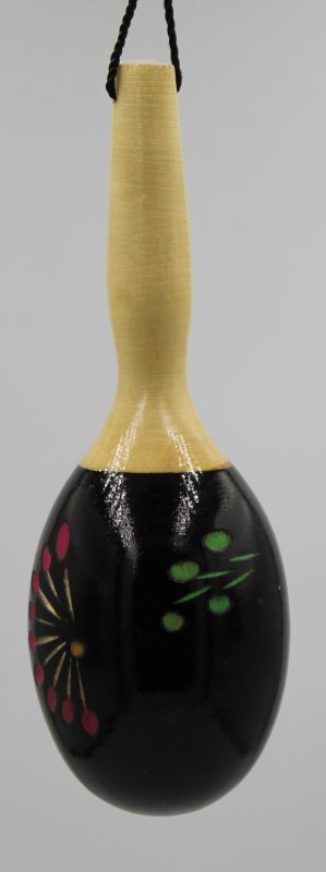 THIS CHRISTMAS ORNAMENT IS IN THE MUSICAL INSTRUMENT GROUPING AND IS OF A BLACK MARACA. STANDS AT 1.75 X 1.75" X 5" TALL, ITIS MADE OF POLY RESIN.