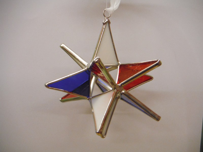 THIS CHRISTMAS ORNAMENT IS MADE OF SILVER METAL AND RED, WHITE, AND BLUE STAINED GLASS TO MAKE A MERIDIAN STAR THAT MEASURES APPROX. 4.5" X 4.5".