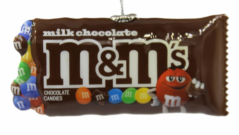 THIS CHRISTMAS ORNAMENT IS OF A BAG OF MILK CHOCOLATE M&M'S. IT MEASURES APPROX. 4" X 1.5" X 0.25" AND IS A BLOW MOLD.