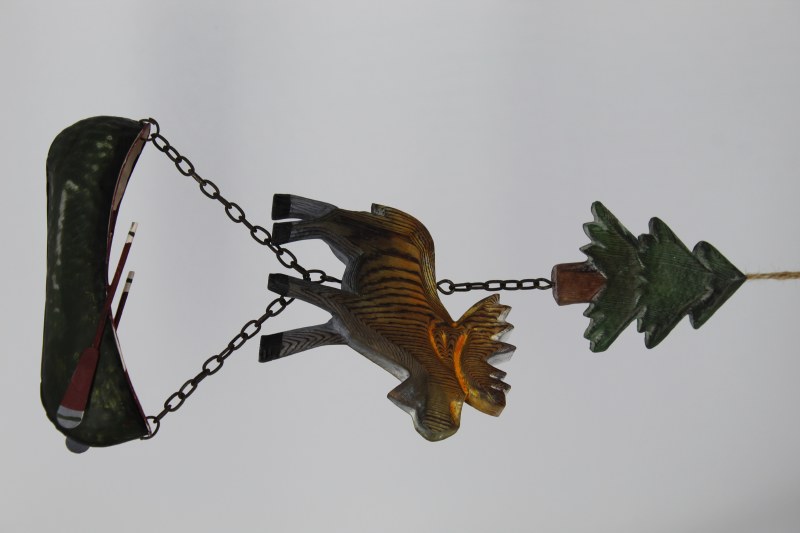THIS CHRISTMAS ORNAMENT IS OF A MOOSE WITH A TREE AND CANOE. IT MEASURES APPROX. 13" X 6" AND IS MADE OF METAL/WOOD.