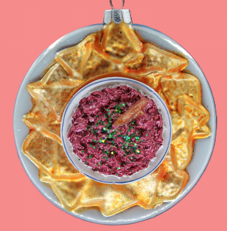 THIS CHRISTMAS ORNAMENT IS A PLATTER OF CHIPS AND A DIP. IT MEASURES APPROX. 4" X 4" X 1.75" AND IS MADE OF GLASS.