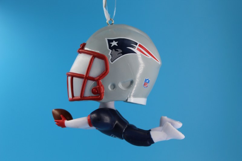 THIS NFL CHRISTMAS ORNAMENT IS OF THE PATRIOTS. IT MEASURES APPROX. 4" X 3" AND IS MADE OF POLY RESIN. Located in the Christmas Shoppe in room D, on a wall - board number 448. Printed maps are available to assist in finding it.