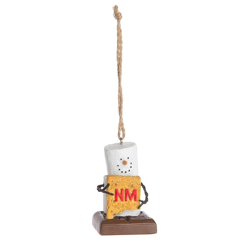 THIS CHRISTMAS ORNAMENT IS MADE OF RESIN AND MEASURES APPROX. 2.5" X 1.5" AND IS OF A SMORE HOLDING A SHAPE OF THE STATE.