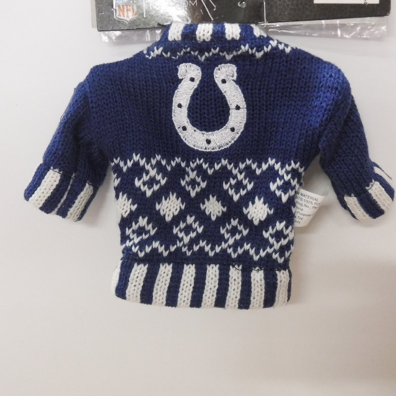 THIS CHRISTMAS ORNAMENT IS A FABRIC SWEATER. IT MEASURES APPROX, 5.5" X 8". A KNIT TEAM SWEATER WITH HANGER REPRESENTING NFL TEAM WITH LOGO.
