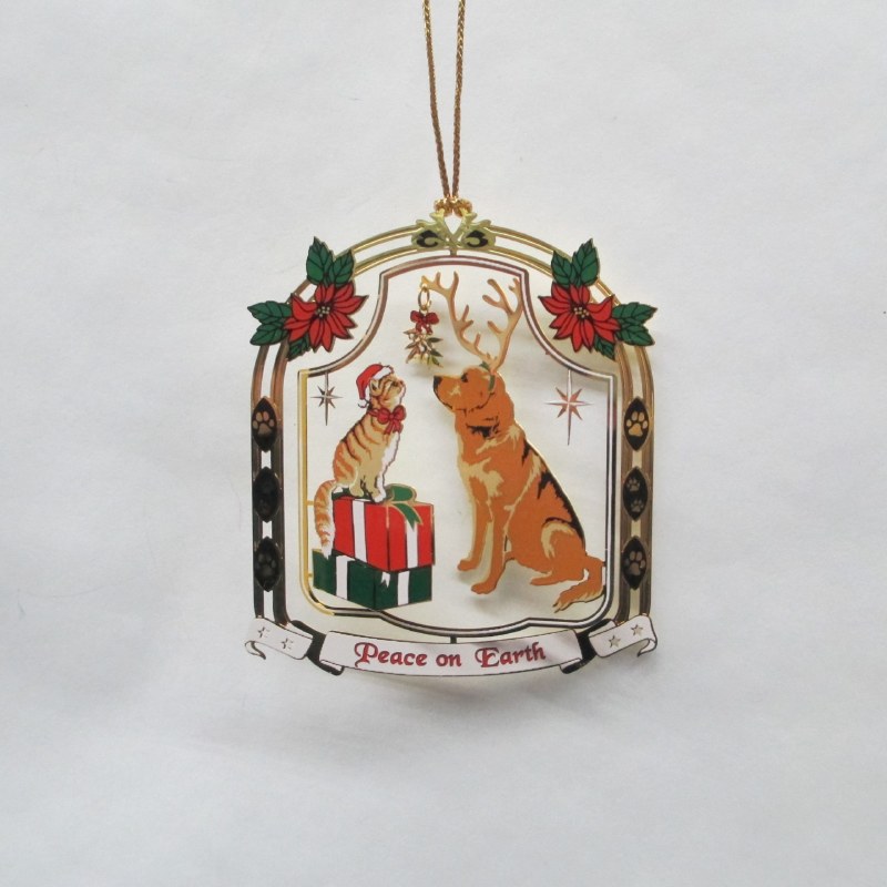 THIS FLAT BRASS ORNAMENT IS OF A DOG WEARING ANTLERS AND A CAT SWERAING A SANTA HAT. THE BANNER AT THE BOTTOM SAYS PEACE ON EARTH. IT MEASURES 2.5" X 2.5".