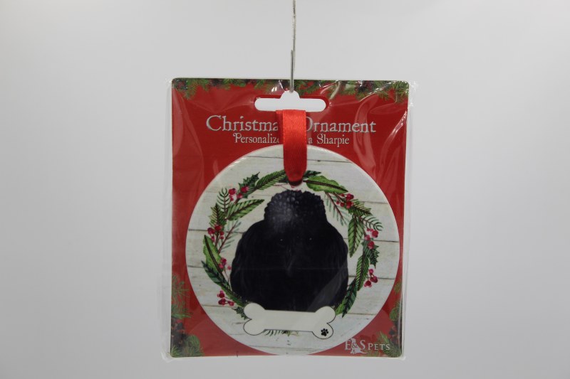 THIS CHRISTMAS ORNAMENT IS OF A POODLE. IT MEASURES APPROX. 3.5" IN DIAMETER AND IS MADE OF PORCELAIN. THIS ORNAMENT CAN ALSO BE PERSONALIZED.