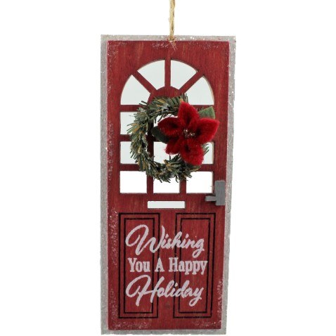 THIS CHRISTMAS ORNAMENT IS MADE OF WOOD AND MEASURES APPROX. 5: X 2.25". "WISHING YOU A HAPPY HOLIDAY" WRITTEN ON RED DOOR.