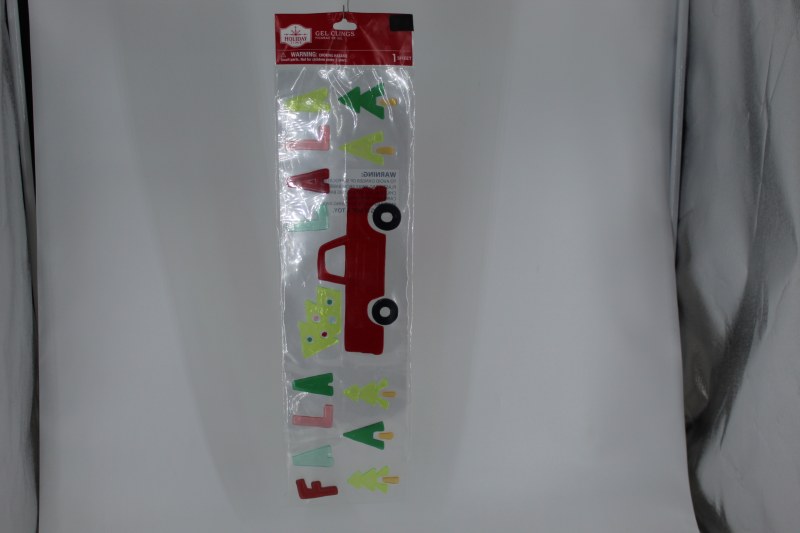THIS WINDOW CLING IS MADE OF GEL AND RESEMBLES A RED TRUCK WITH TREE , IT MEASURES 17. 5" X 4.25"