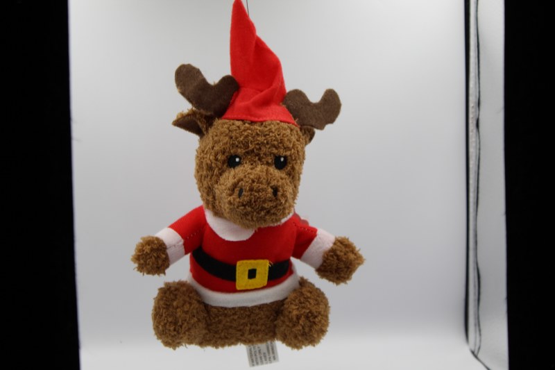 THIS IS A SITTING PLUSH ANIMAL THAT MEASURES APPROX. 5.75" X 3" X 7.5". IT IS A REINDEER WITH TEXTURED FUR IN A SANTA SUIT.