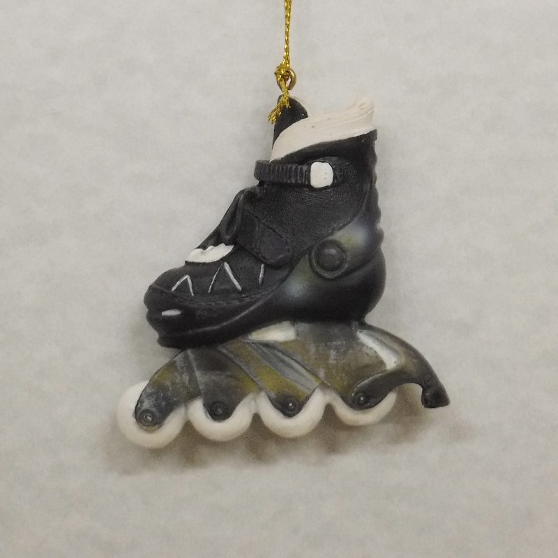 THIS CHRISTMAS ORNAMENT IS A BLACK ROLLER BLADE WITH WHITE WHEELS. MEASURING 2.75" X 2.75" AND MADE OF RESIN.